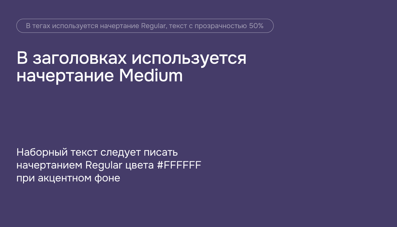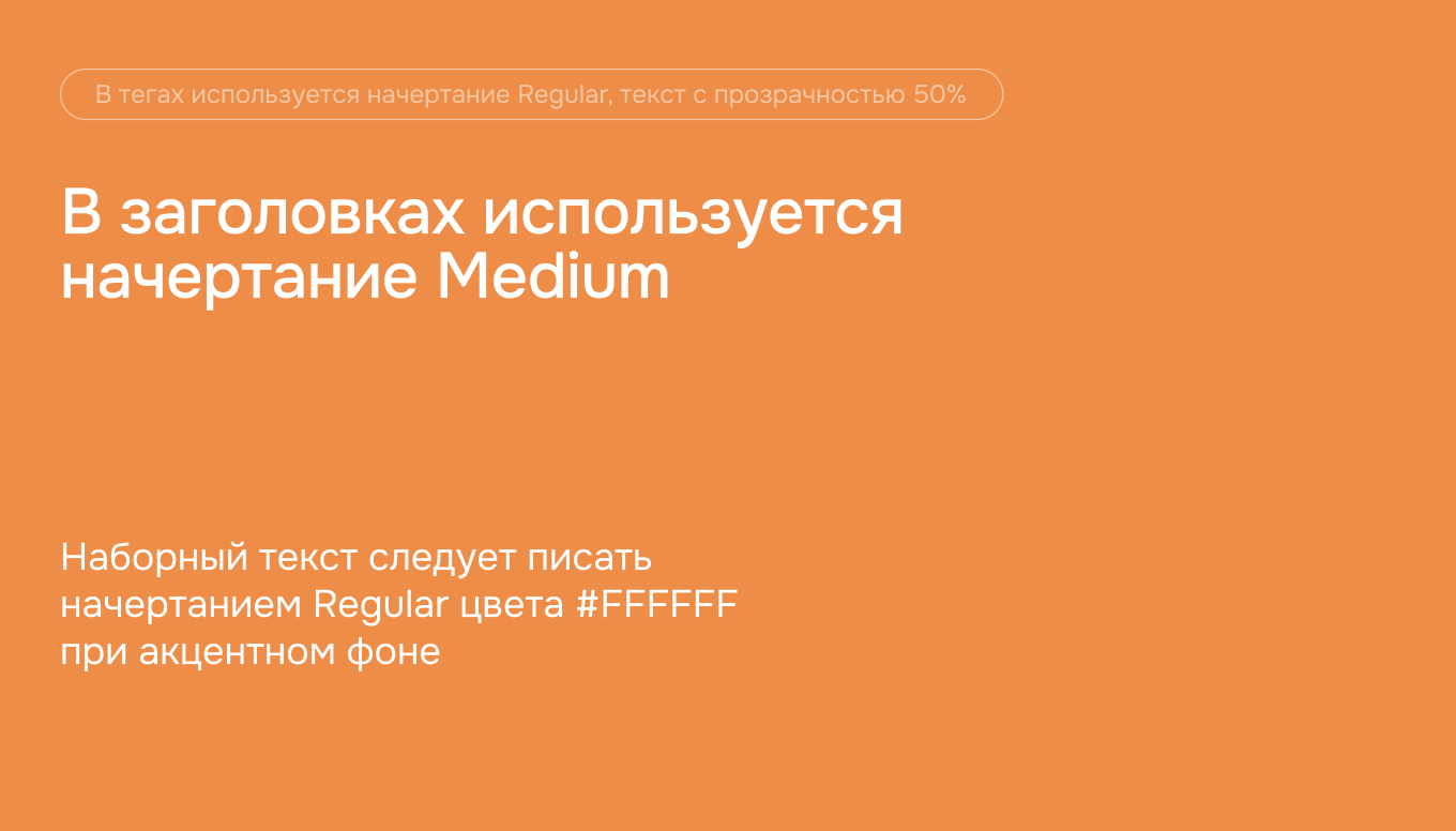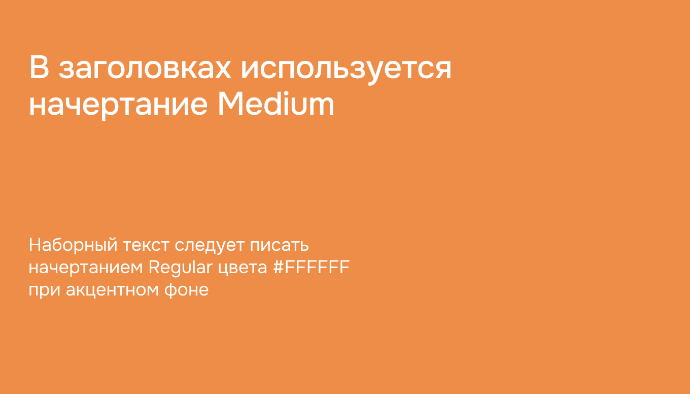 Начертание для заголовков — Medium. Для наборного текста — Regular. Другие начертания используются ограниченно и не применяются для построения иерархии.